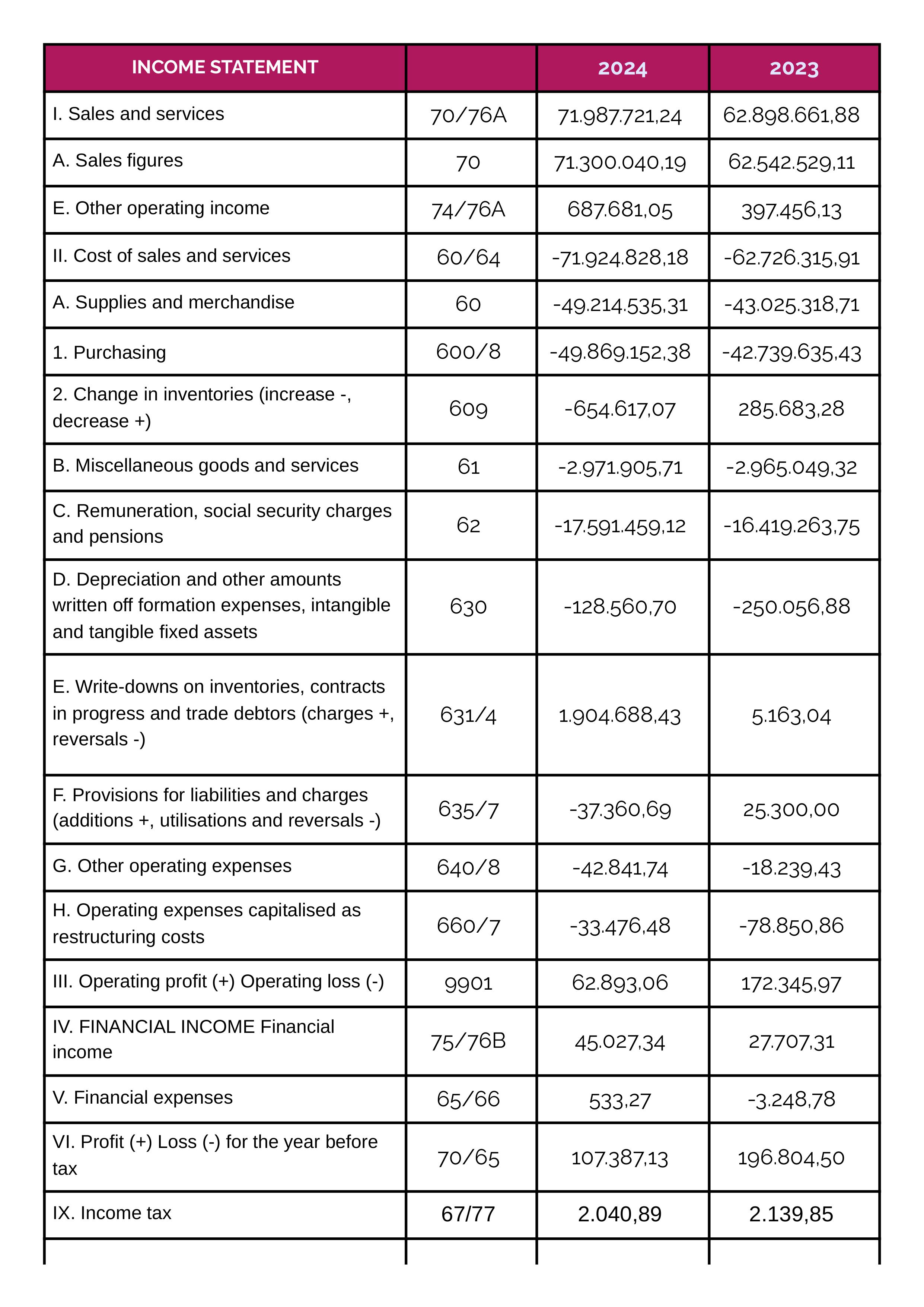 Sales amounted to €71,987,721, compared with €62,898,662 the previous year. This reflects an acceleration in the delivery of products and services, mainly for the City of Brussels and the CPAS