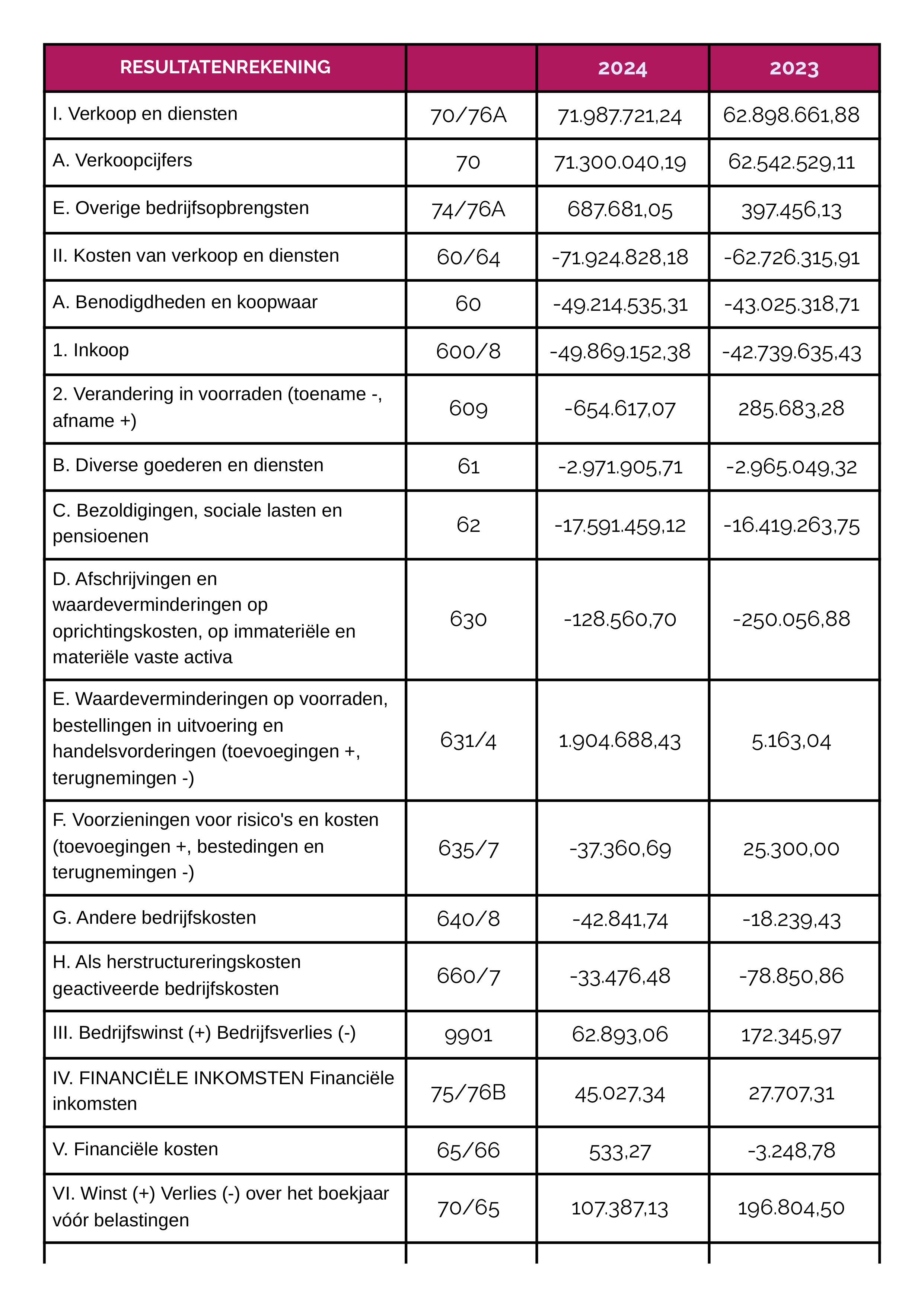 De omzet bedroeg € 71.987.721, tegenover € 62.898.662 vorig jaar. Dat weerspiegelt een versnelling in de levering van producten en diensten, voornamelijk voor de Stad Brussel en het OCMW.